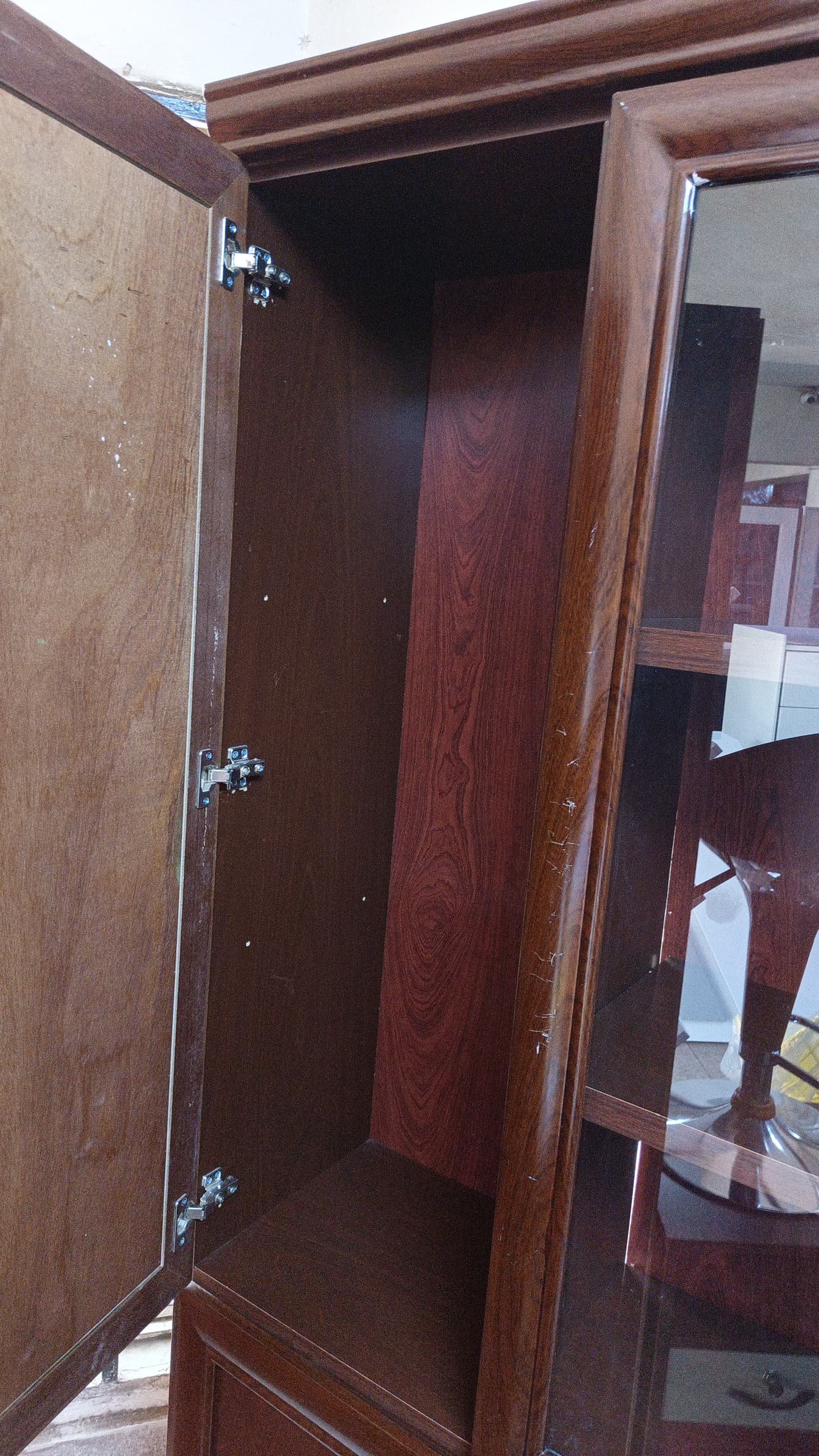 Its glossy red-brown veneer finish radiates warmth and sophistication, making it a standout piece for both home and office settings.