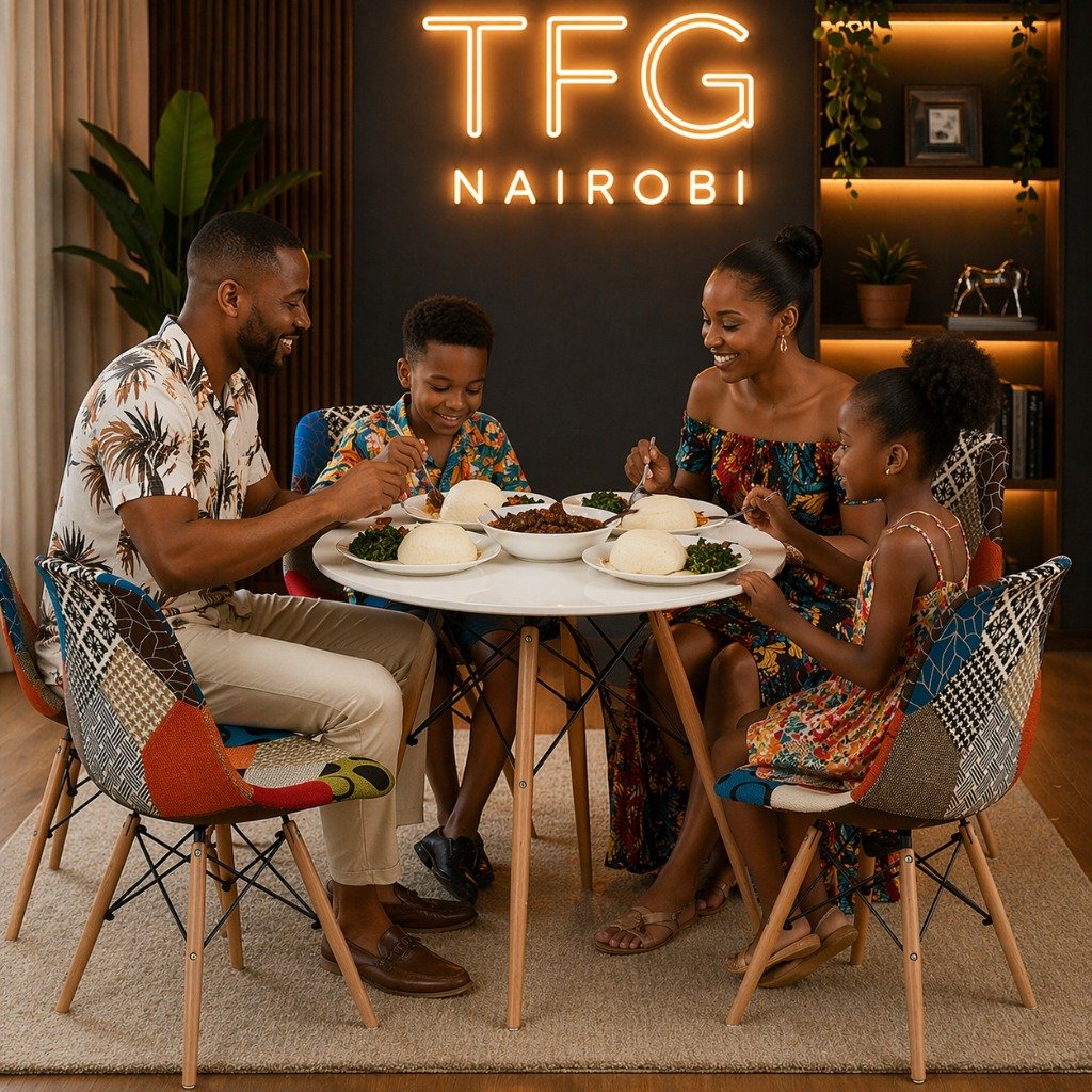 Creating lasting memories: A Kenyan family shares a traditional meal at the stylish EV1897 Dining Set in their Karen home.