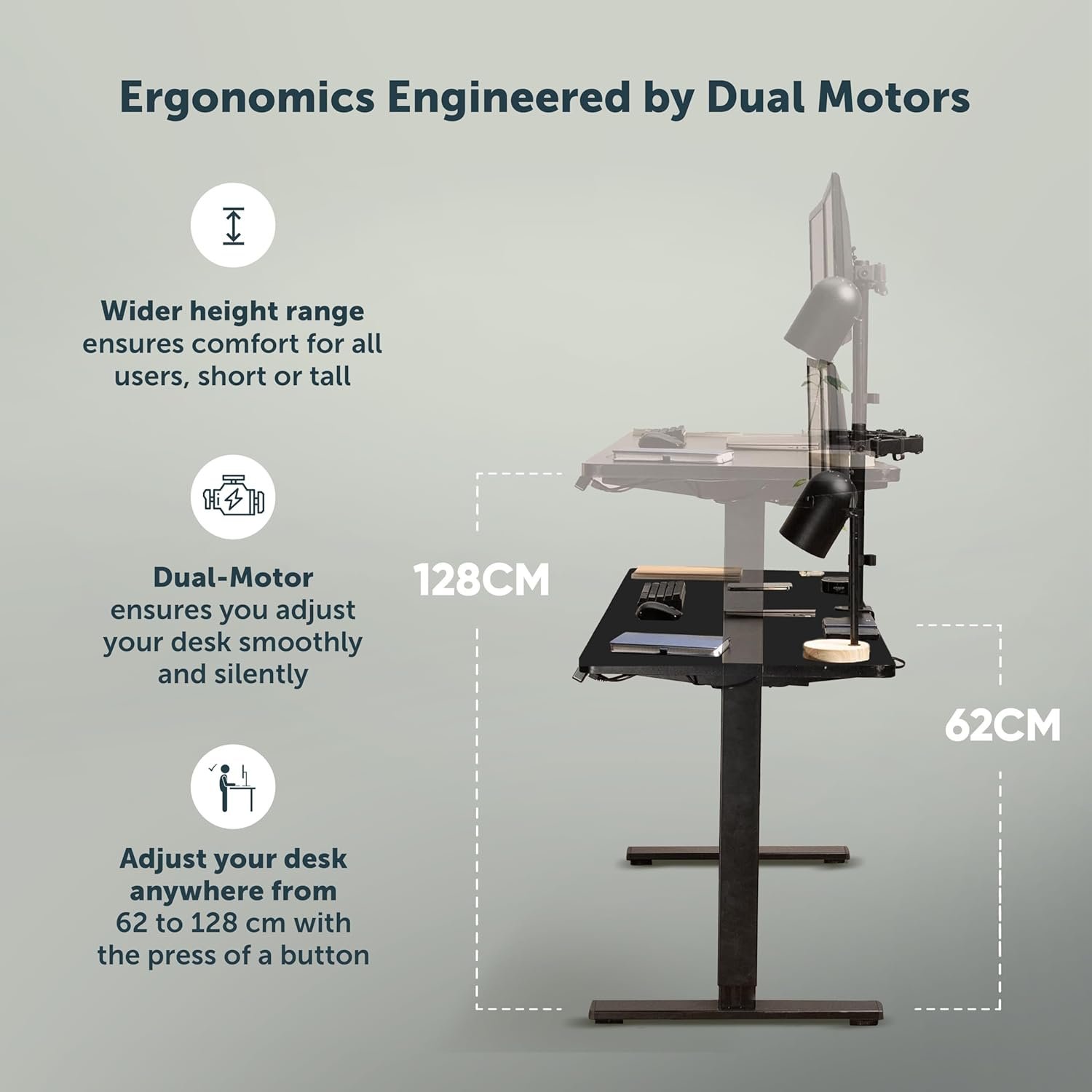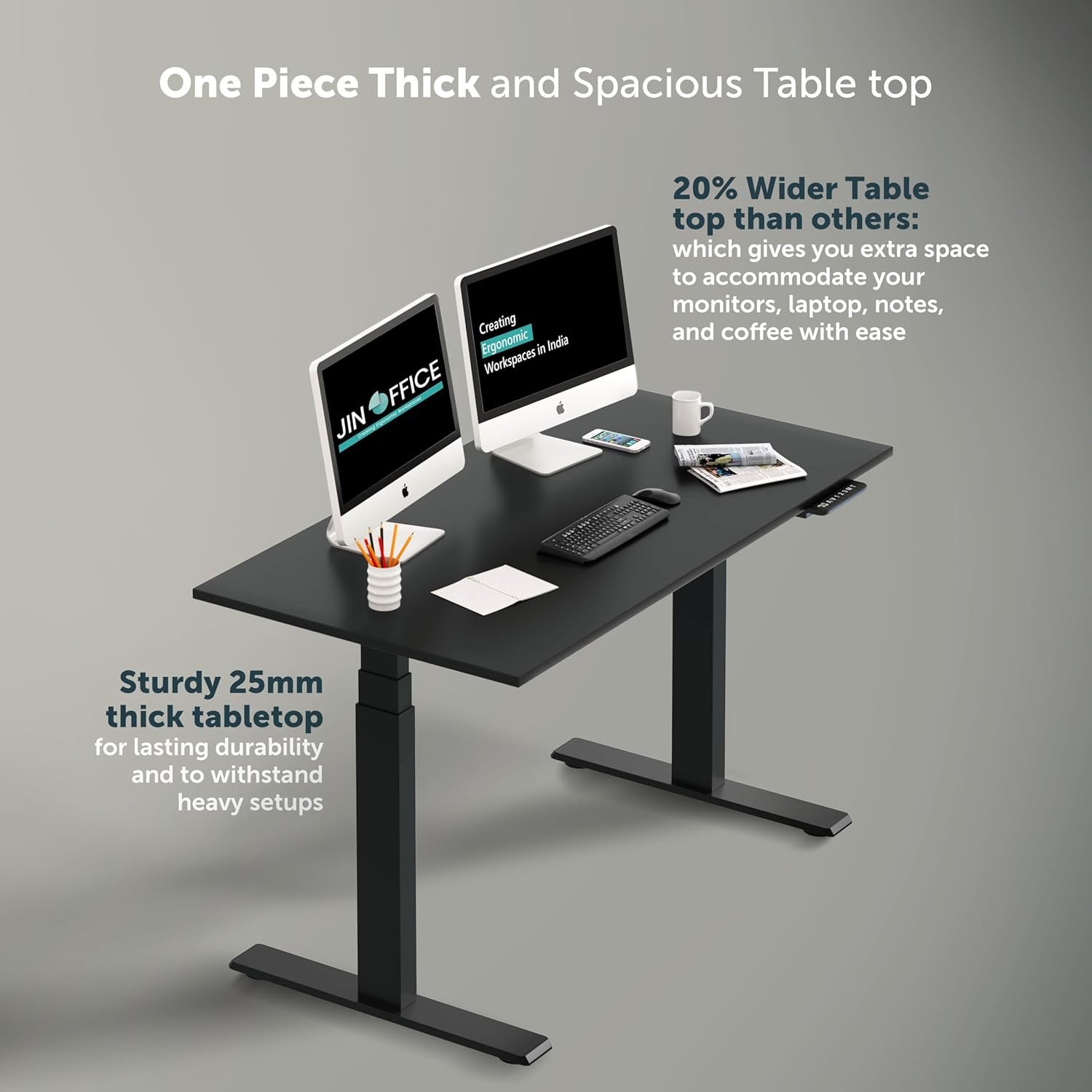 While many entry-level models use a single motor, the JHT8-ED3 features a dual motor electric desk system. This ensures a whisper-quiet, synchronized lift that handles heavy equipment with ease, making it the best height adjustable desk for those with multi-monitor setups.