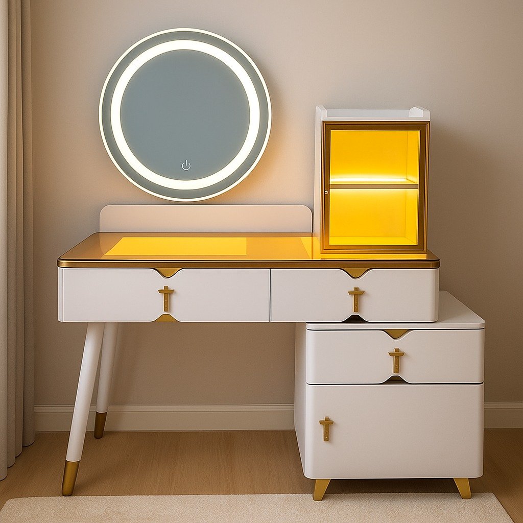 The M103 dresser doesn’t stop at looks—it also delivers on storage. With upper drawers, a side cabinet with extra drawers, and a vertical amber-gold illuminated box, there’s space for makeup, perfumes, jewelry, skincare, and even styling tools. Every design choice—from the cross-inspired gold handles to the gold-capped tapered legs—creates a sense of style and balance.