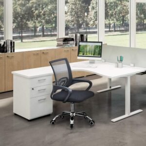 Complementing the desk is a three-drawer mobile cabinet. Designed for both form and function, the cabinet provides ample storage space for important files, supplies, and personal items, ensuring that everything needed for a productive day is within arm’s reach. The mobile aspect allows for flexible positioning, whether tucked neatly under the desk or placed alongside it for easy access.