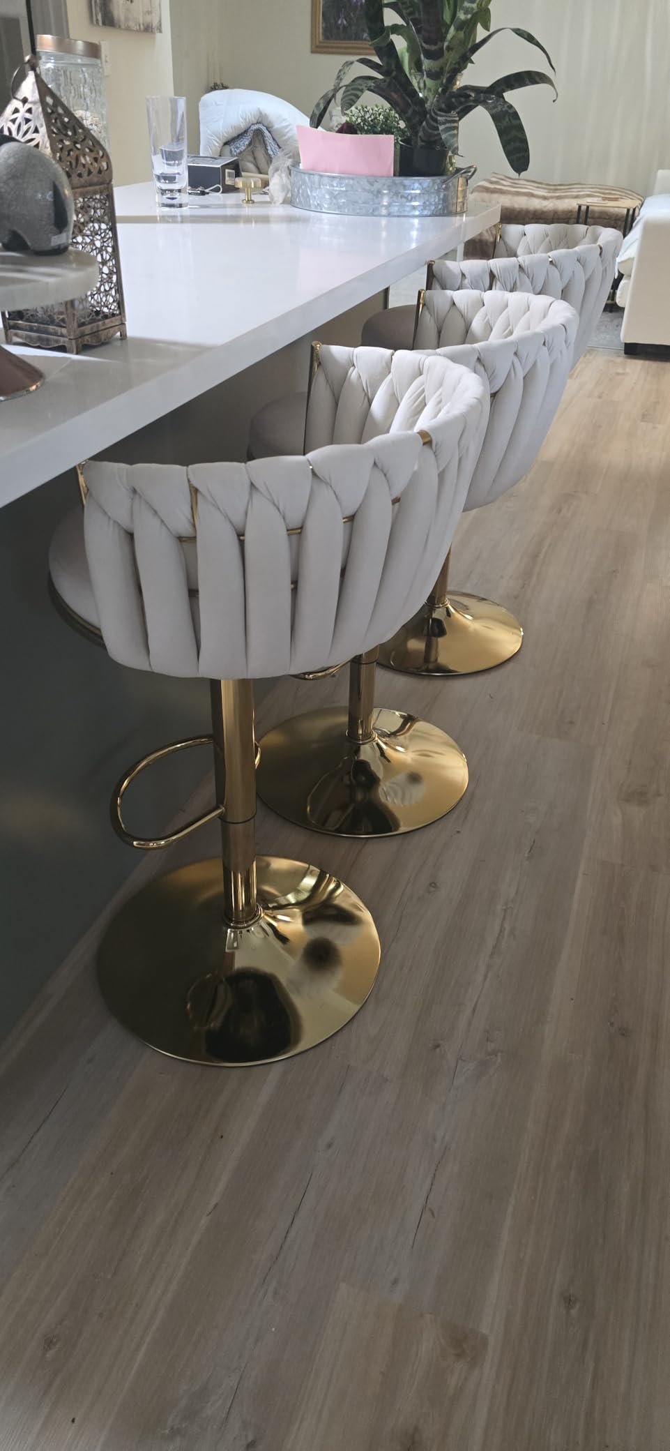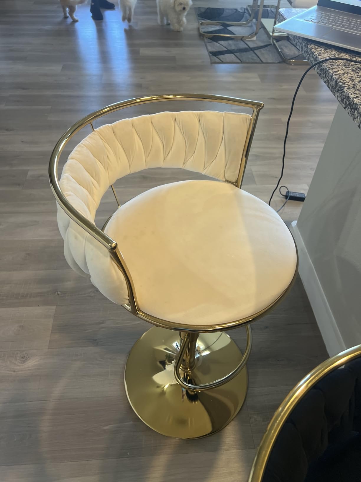 Love these! They came packaged carefully. There is a few defects on the tufting but overall they are nice! The gold metal appears to have no defects as I had seen on a few other pieces posted. Glad I took the chance on these bar stools because they are very nice. They were easy to assemble. The cushioning is fairly comfortable but they do deflate a bit when sat on for a period of time — hopefully they don’t go flat with use. Also, for those with LONG LEGS — they are short seats — your legs will stick out way beyond the seat space which is a bit uncomfortable. Thankfully the stools have decent foot support on the bar below. They do swivel well. Haven’t used them much — so if an issue arises I’ll update this review. Price was good for the 4 stools, and shipping was fast which is a plus!! Have only owned them 2 months and again, haven’t had much use but did note the above mentioned issues. For reference on leg length: I’m a 34” inseam. The stools do adjust for height. Just wish the seat length was a little bit longer. However, very nice stools, beautiful gold/cream color and functional, look elegant alongside the Brown/Black/Gold granite bar countertops. Seller was great!